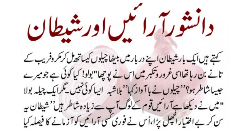 آرائیں نے کہا کاروباری اصول کے مطابق تمام تر معاملات پہلے ہی کلئیر کرلینے چاہئیں تاکہ بعد میں کسی قسم کا کوئی لڑائی جھگڑا نا ہو… حصہ شیطان کی مرضی کا ہوگا اور فصل.میری مرضی کی ہوگی شیطان نے عیاری سے کام لیتے ہوئے کہا جو بھی فصل بوؤ کے اس کا اوپر والا حصہ میرا ہوگا اور نیچے والا آرائیں کا ہوگا.. شیطان کچھ ماہ بعد واپس آیا تو پتہ چلا آرائیں.نے پیاز کی فصل بوئی تھی لہذٰا پیاز آرائیں کے حصے میں آئے اور اوپر کے پتے شیطان کے حصے میں.. شیطان نے کوئی پرواہ نا کی اور اگلی فصل کے لیے مزید رقم دیتے ہوئے کہا