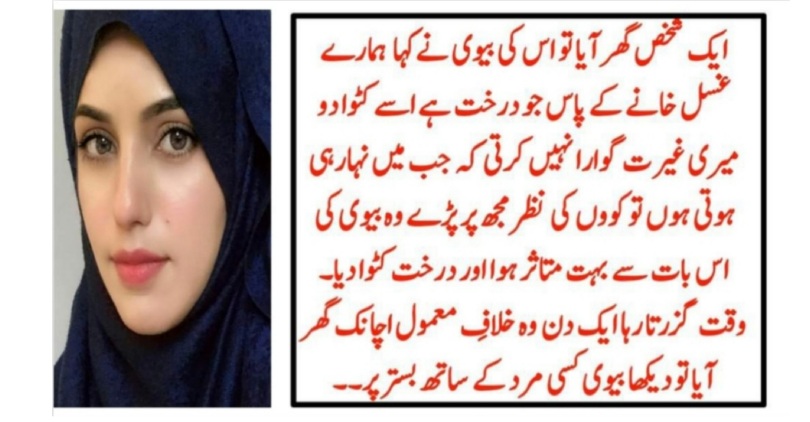 ایک شخص گھر آیا تو اس کی بیوی نےکہا :۔ “ہمارے غسل خانے کے پاس جو درخت ہے اسے کٹوا دو ، میری غیرت گوارا نہیں کرتی کہ جب غسل کررہی ہوں تو پرندوں کی نظر مجھ پر پڑے۔” وہ بیوی کی اس بات سے بہت متاثر ہوا اور درخت کٹوا دیا۔ وقت گزرتا رہا۔۔۔۔ ایک دن وہ خلافِ معمول اچانک گھر آیا تو دیکھا بیوی کسی مرد کے